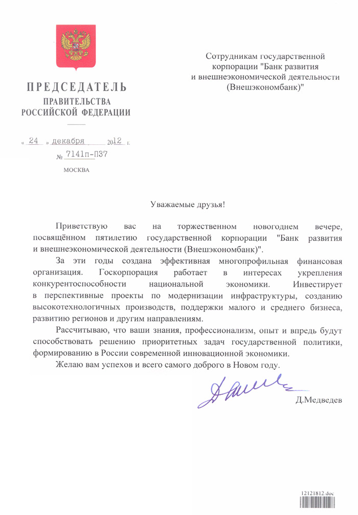Приветствие Председателя Правительства Российской Федерации Дмитрия Медведева коллективу Внешэкономбанка